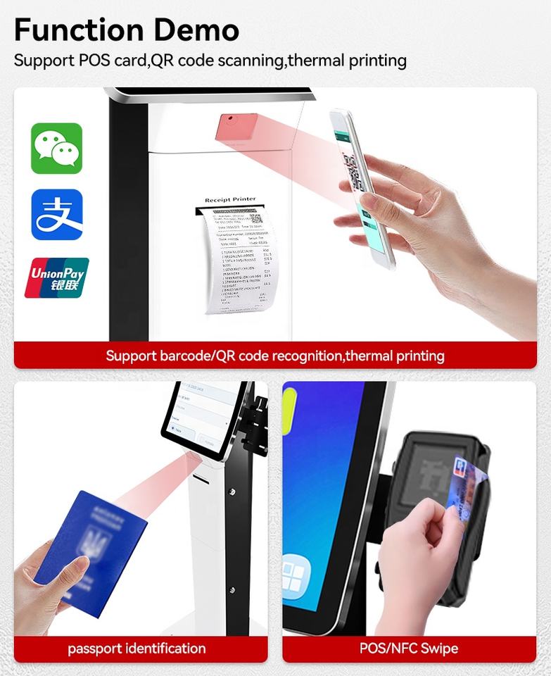 Módulos funcionales opcionales: Los módulos opcionales, como una impresora, un escáner de pasaportes y un escáner de códigos QR, proporcionan la flexibilidad para adaptar el quiosco a necesidades específicas, mejorando su utilidad en diferentes entornos.
