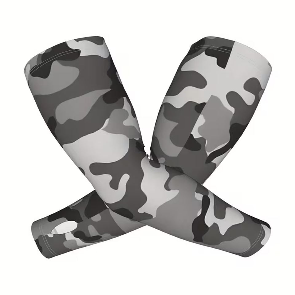 Mangas de brazo grises con gráficos de alta elasticidad, personalizadas, de última tendencia, para adultos, del proveedor principal de ropa deportiva para exteriores con protección UV Pro-Fit.