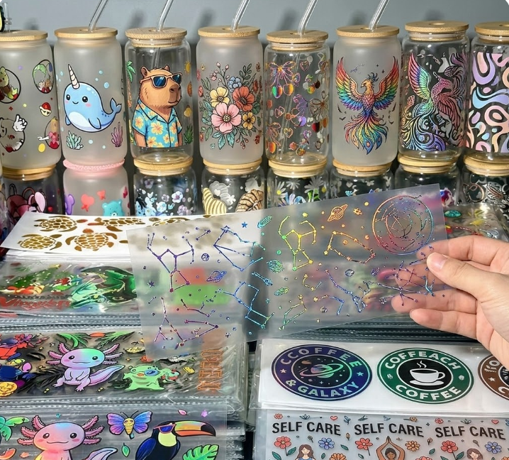 Vinilos UV para Vasos, Adhesivos Personalizados de Transferencia, Diseño de 16 oz, Resistentes a los Arañazos, Acabado Brillante, Serigrafía, Venta al por Mayor
