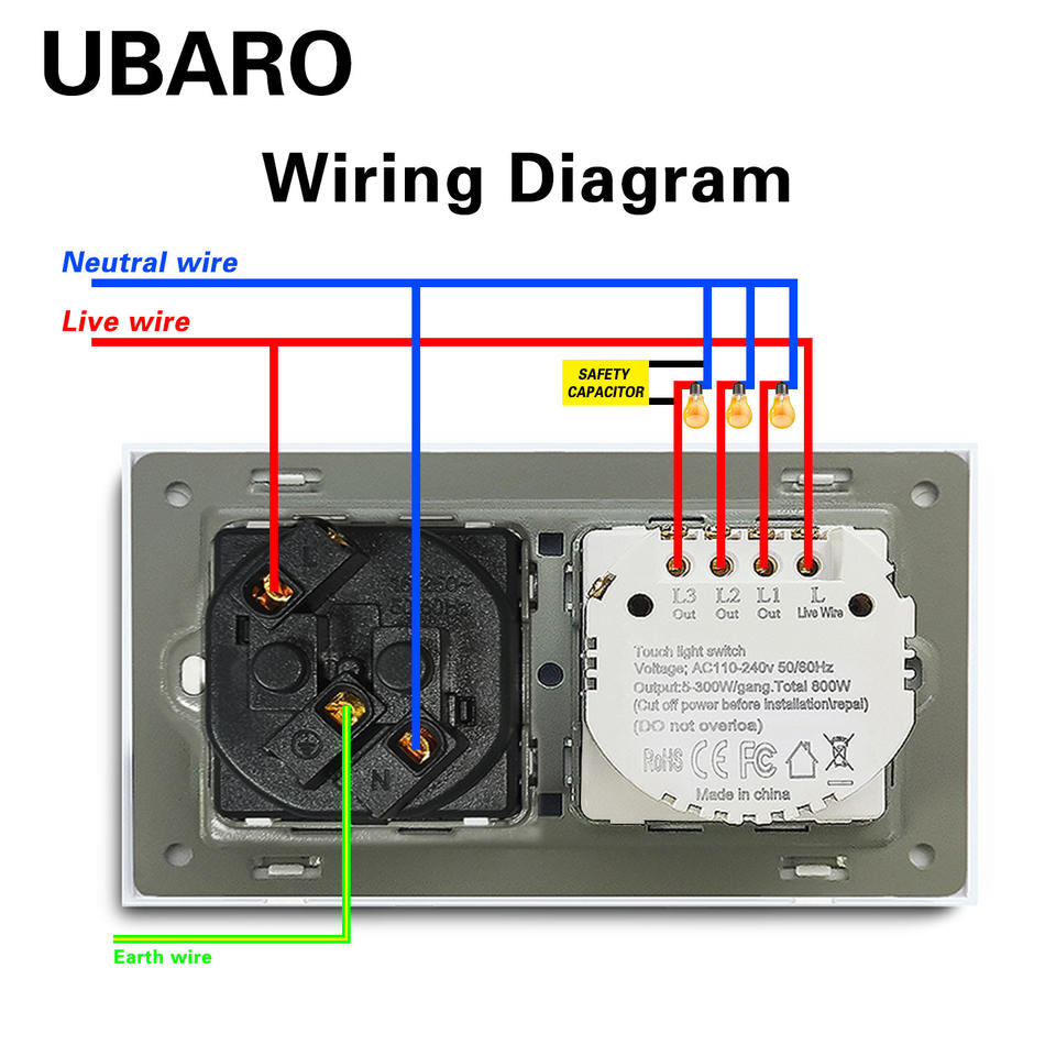 Interruptor Táctil Ubaro Tipo 146, Combinación de Enchufe, 110-240V, Panel Redondo Doble Empotrado, Sensor con Función de Autoprueba