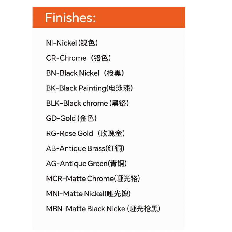 CR (cromo), NI (níquel),BK (pintura negra),GD (oro)