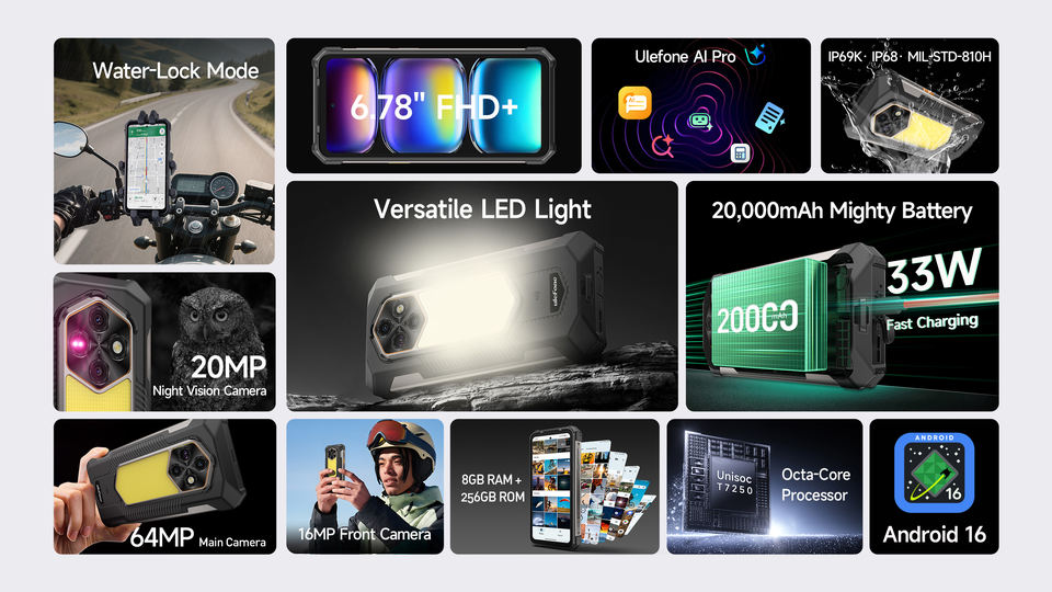 Teléfono Móvil Resistente Ulefone Rugking 5 Pro, 20000 mAh, 6.78 Pulgadas, Visión Nocturna, 8+256 GB, Android 16
