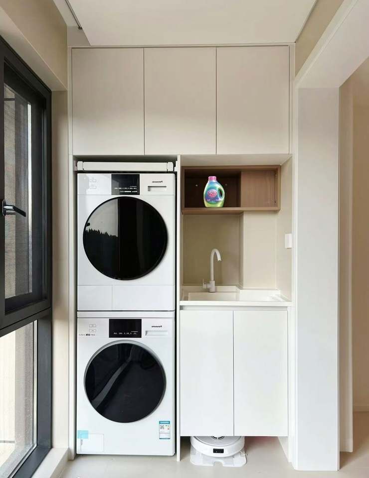 Solución de organización de lavandería definitiva: armarios modulares para lavadora y secadora para espacios domésticos eficientes y elegantes europeos