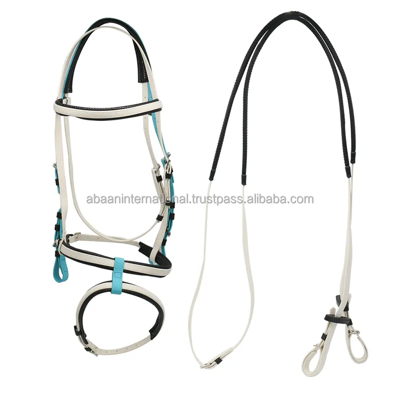 El juego de brida Ultra Racing con Riendas de hebilla está hecho con dos capas de correas de polietileno de 5/8 "de ancho y herrajes de acero inoxidable