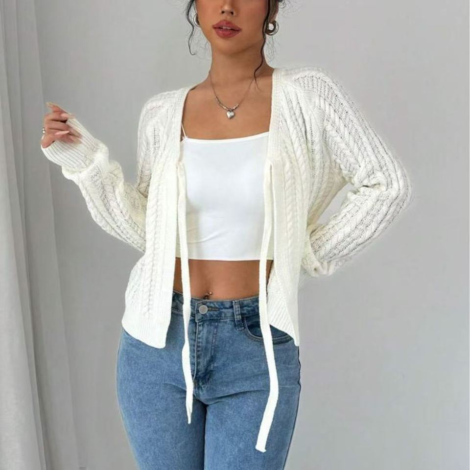 Cárdigan de diseño de punto de cordel con cuello en V desabotonado, nuevo suéter blanco informal Vintage con correa de lazo para mujer