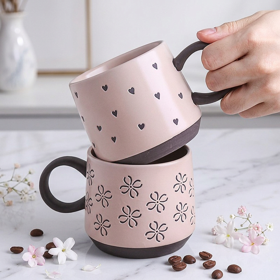 Juego de Tazas de Cerámica Pintadas a Mano con Colores Subesmaltados, Lindos Diseños de Corazón/Pez/Flores, Creativas para Parejas, Aptas para Lavavajillas