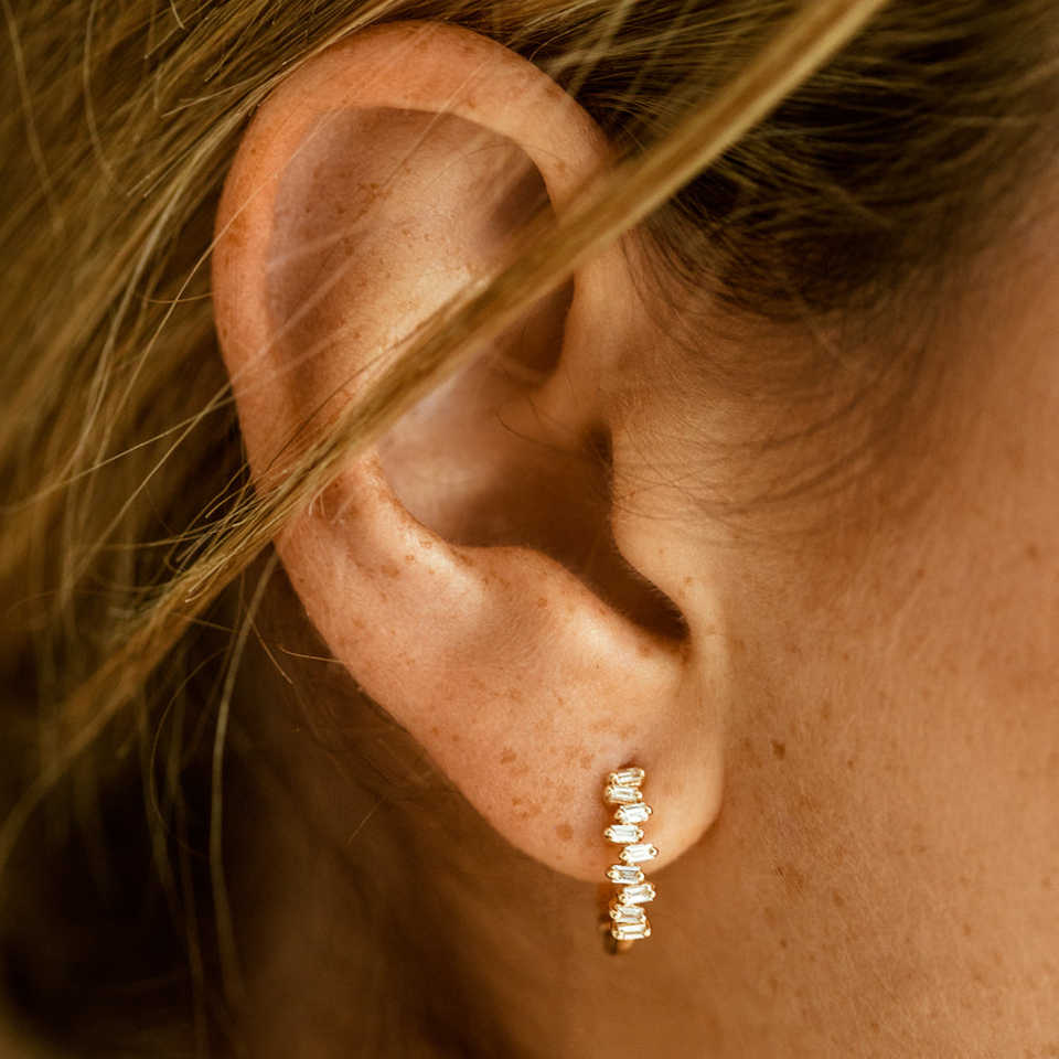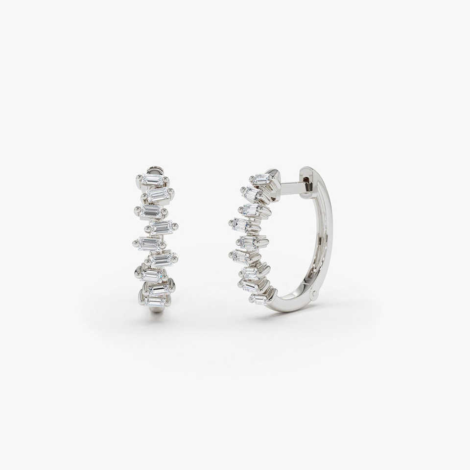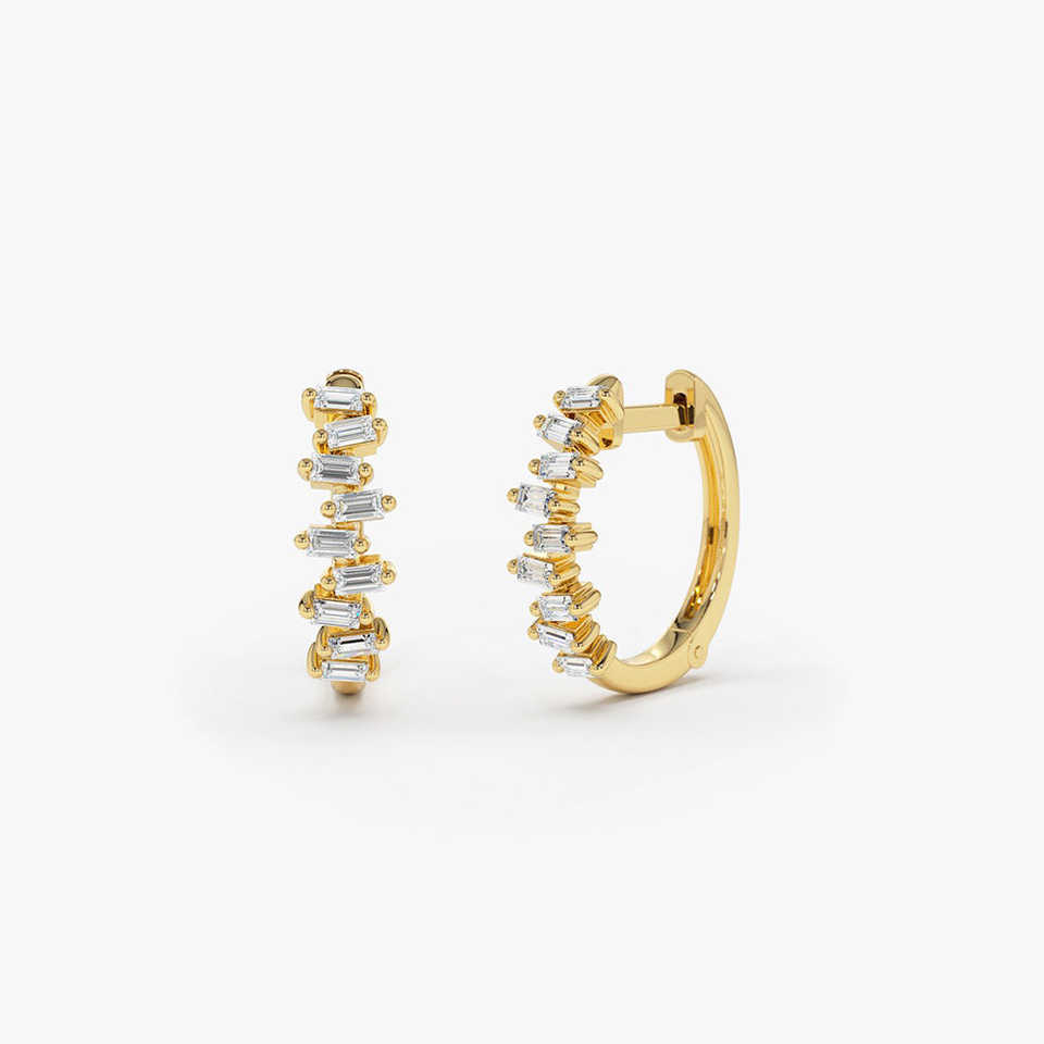 Venta al por mayor de tachuelas de oro macizo conjunto horizontal Mini Baguette Lab Grown Diamond Round Shape Huggie Earring 14K Gold Diamond Studs