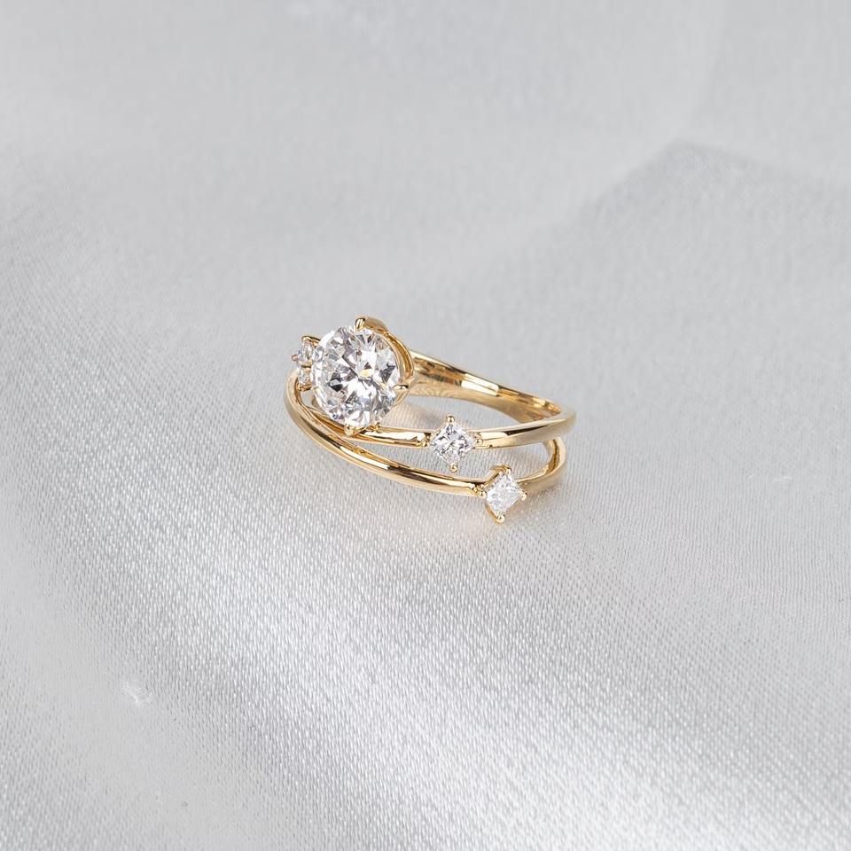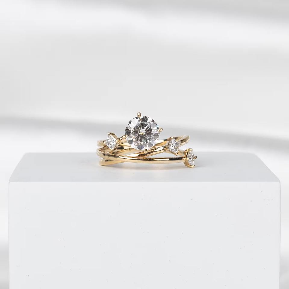Anillo de Diamantes Único con Corte Princesa Redondo, Cultivado en Laboratorio, Oro Amarillo de 14K, Banda de Boda Curva, Regalo de Compromiso o Aniversario