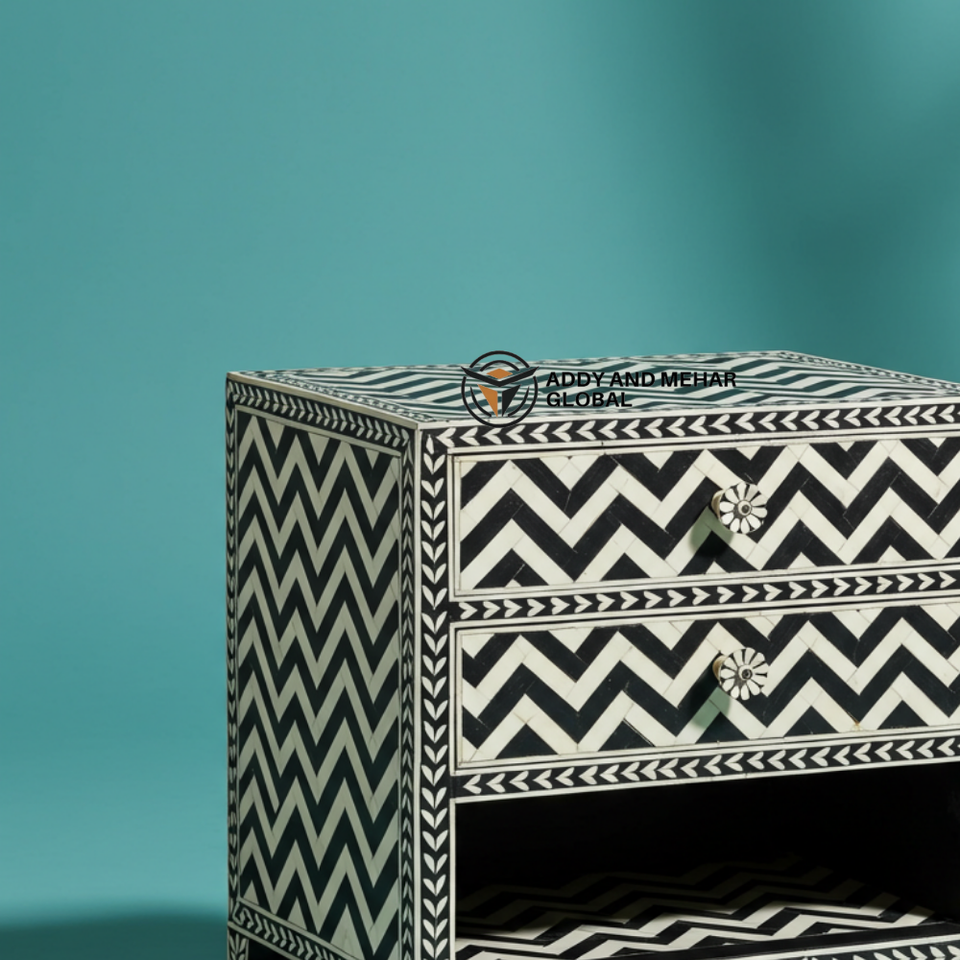Mesa de Noche Moderna de Diseño Único con Incrustaciones de Hueso Negro, 2 Cajones, Decoración Floral Ecológica Hecha a Mano para Dormitorio, Precio al por Mayor