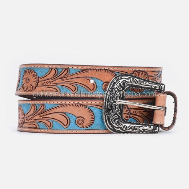 Cinturón de herramientas de cuero occidental de moda para hombre con estilo en relieve de hoja de diseño hecho a mano único hebilla de latón de vaquero grabado floral
