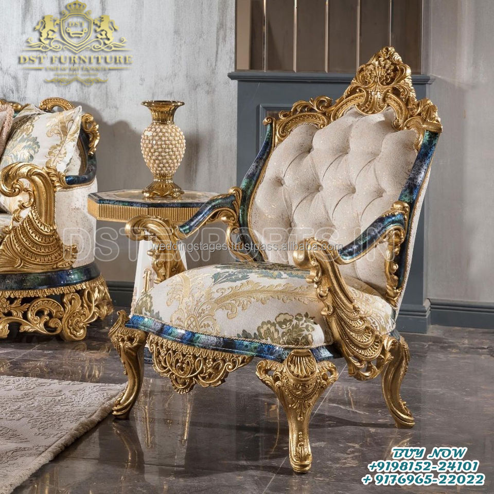 Exclusivo y Majestuoso Juego de Sofás Modernos para Sala de Estar, Artesanía India, Madera de Teca Tallada a Mano, Duradero, Tamaño Personalizado, Dorado