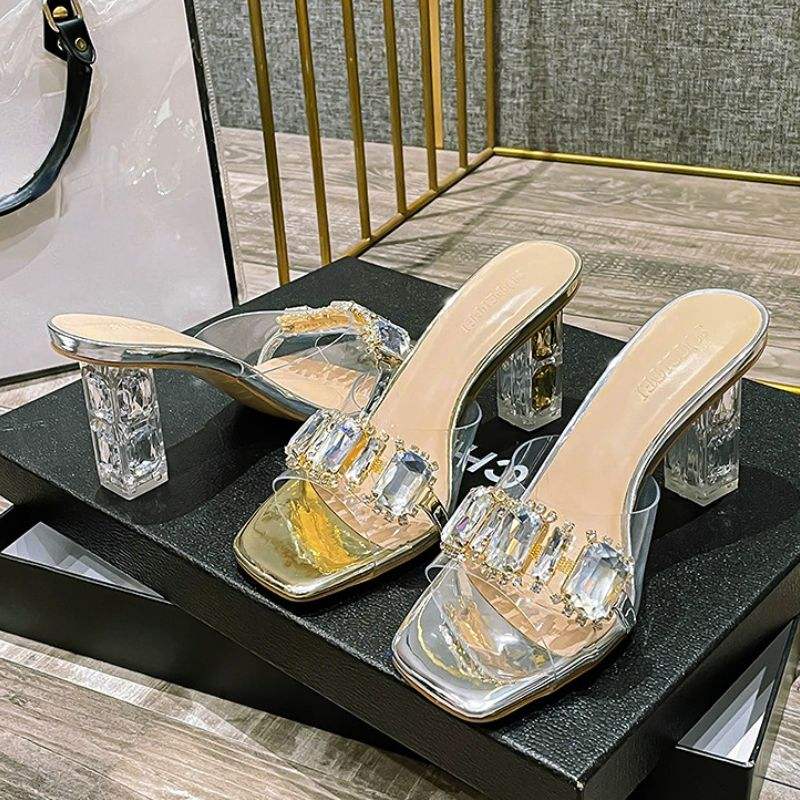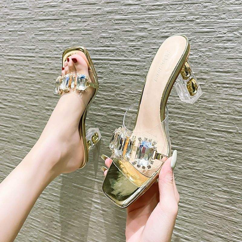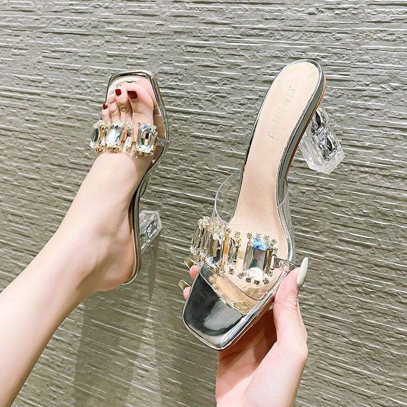 Sandalias Únicas para Mujer, Cómodas, de PVC, Sexys, con Pedrería, Transparentes, con Tacón de Bloque