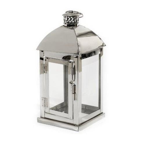 Farol moderno de forma cuadrada con paneles de vidrio transparente y marco plateado, ideal para exteriores y el hogar.