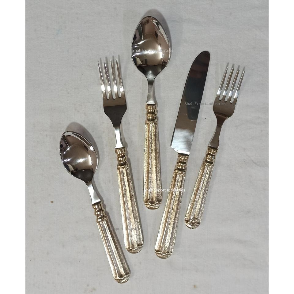Juego de cubiertos único de acero inoxidable con mango de latón dorado Acabado en plata Mesa de comedor para el hogar Juego de cubiertos