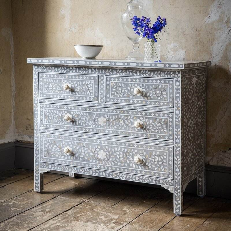 Mueble de Salón con Cajones y Incrustaciones de Hueso y Nácar, Estilo Único, 4 Cajones