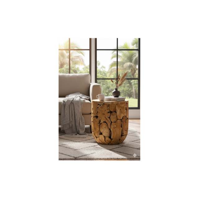 Rustic Teak Root Cylinder Side Table Handmade Wooden Furniture