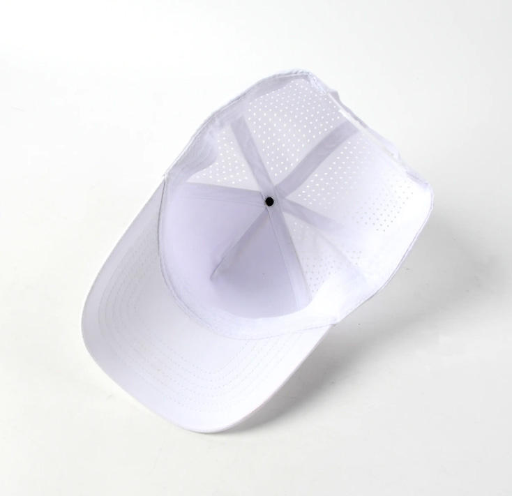 Unisex transpirable de alta calidad impermeable personalizado Parche de goma Logo 5 paneles Golf camionero sombrero corte láser agujero perforado gorra deportiva