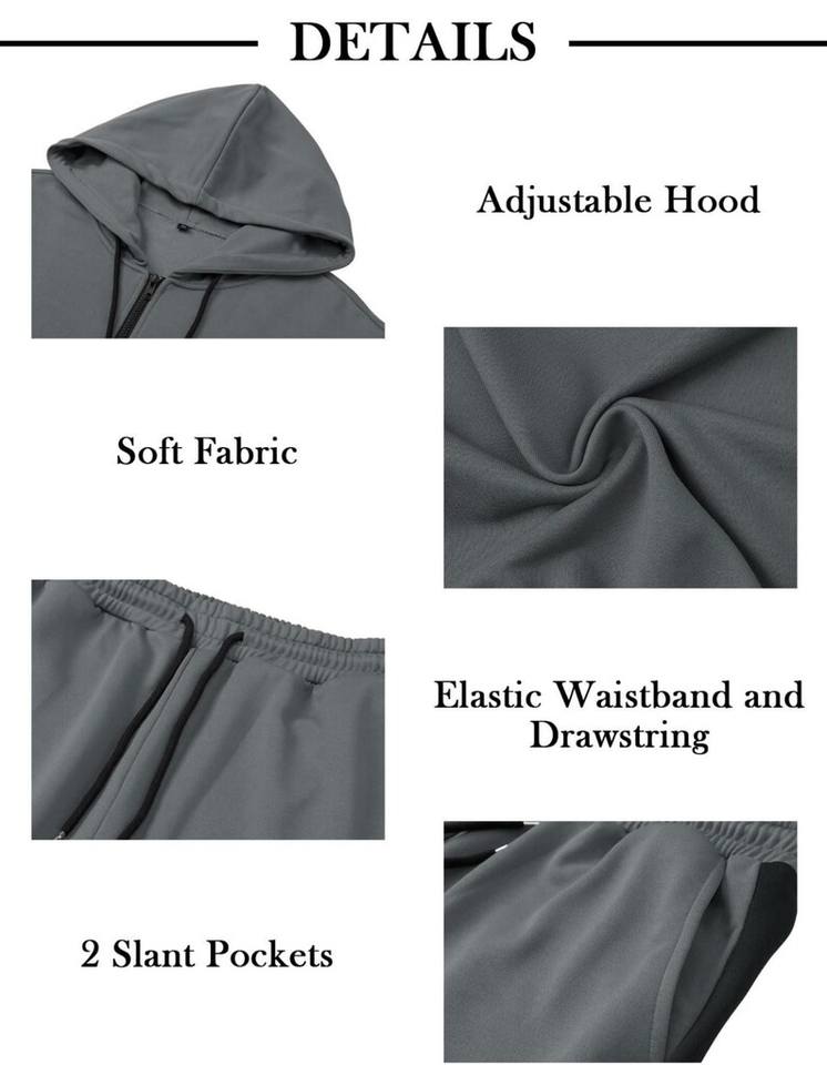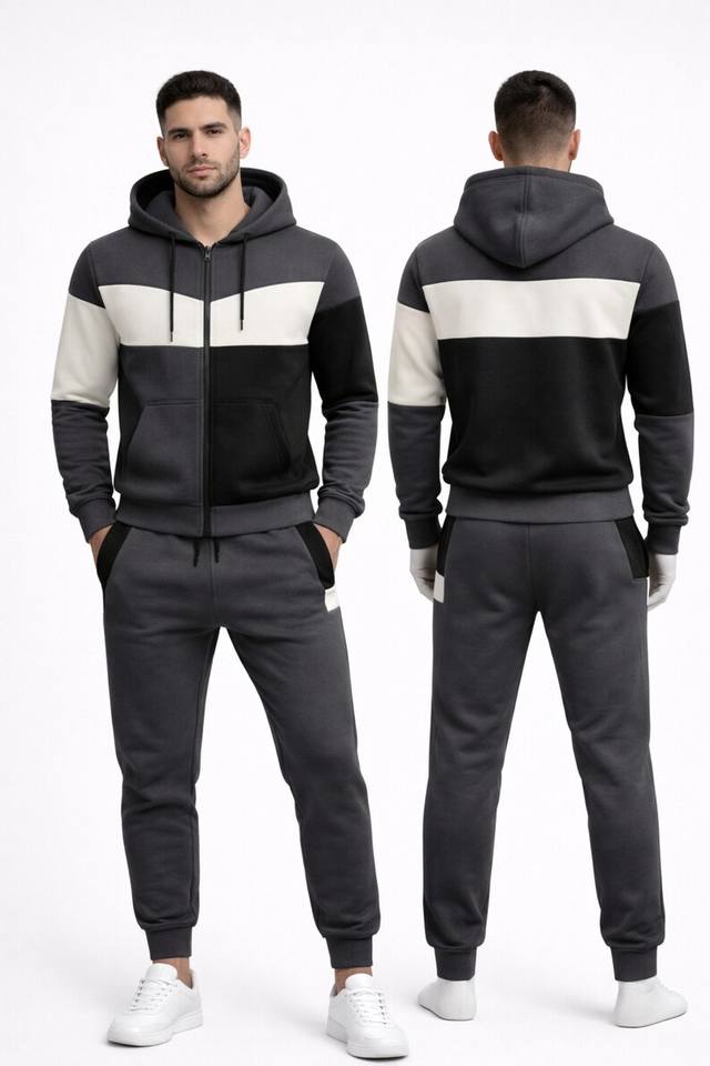Conjunto deportivo unisex con bloques de color, sudadera con capucha y cremallera, y pantalones deportivos a juego, ropa de calle.