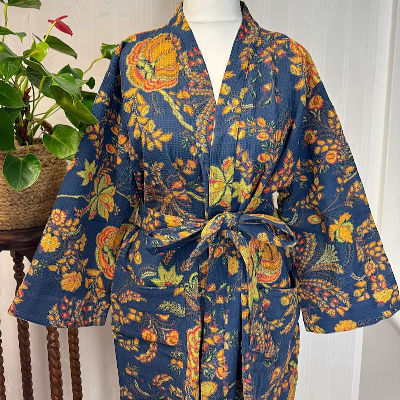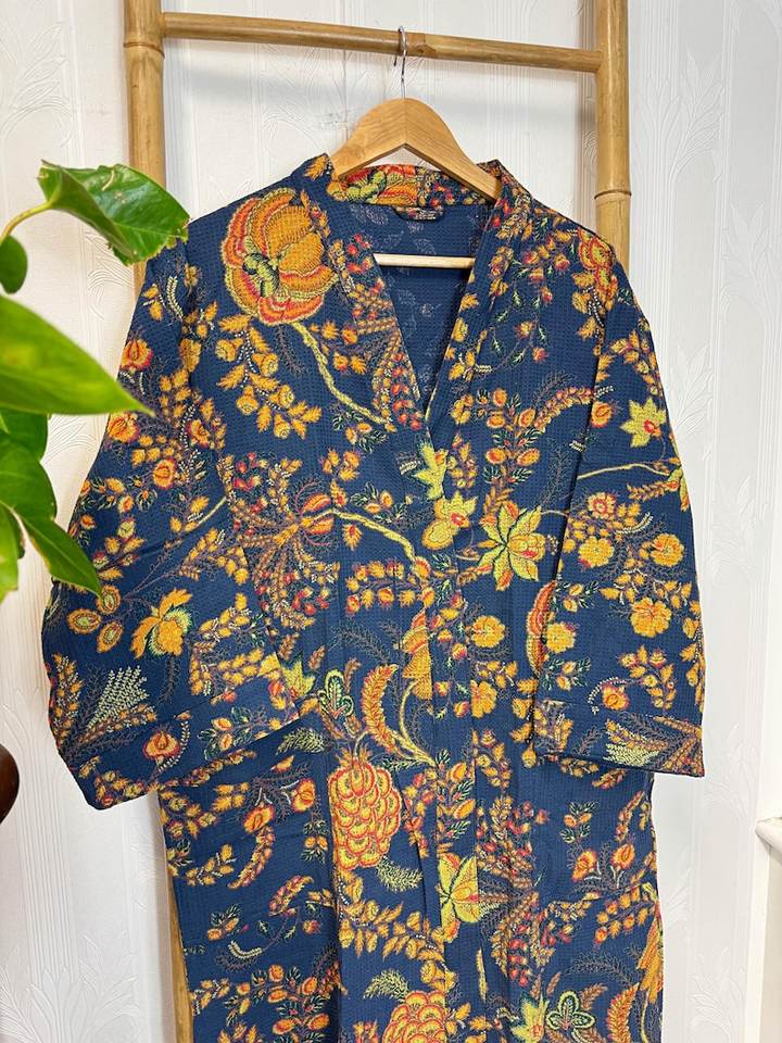 Bata de baño unisex de algodón puro estampado a mano para casa, Kimono de verano, Spa floral, playa, Primavera, azul marino, mostaza