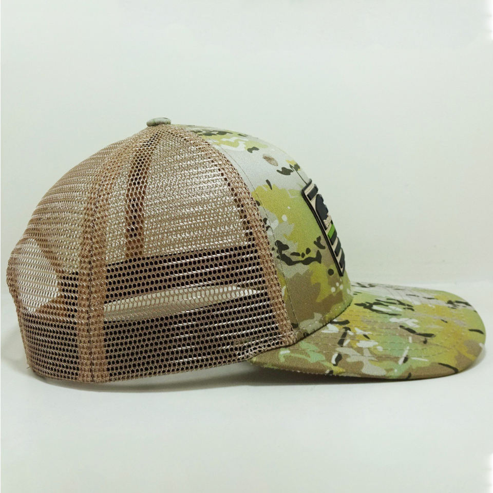 Unisex Vietnam OEM 6 paneles de goma/silicona Logo parches camionero sombreros camuflaje impreso Snapback sombrero ligeramente curvado ala Formal