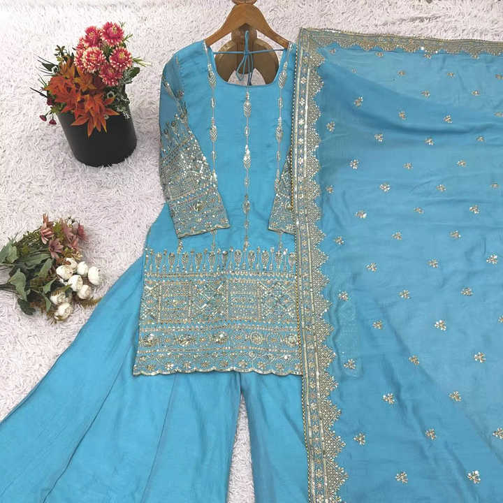 Conjunto de Traje Sharara Bordado en Seda Azul Hielo de Primera Calidad Unity Luxure con Dupatta