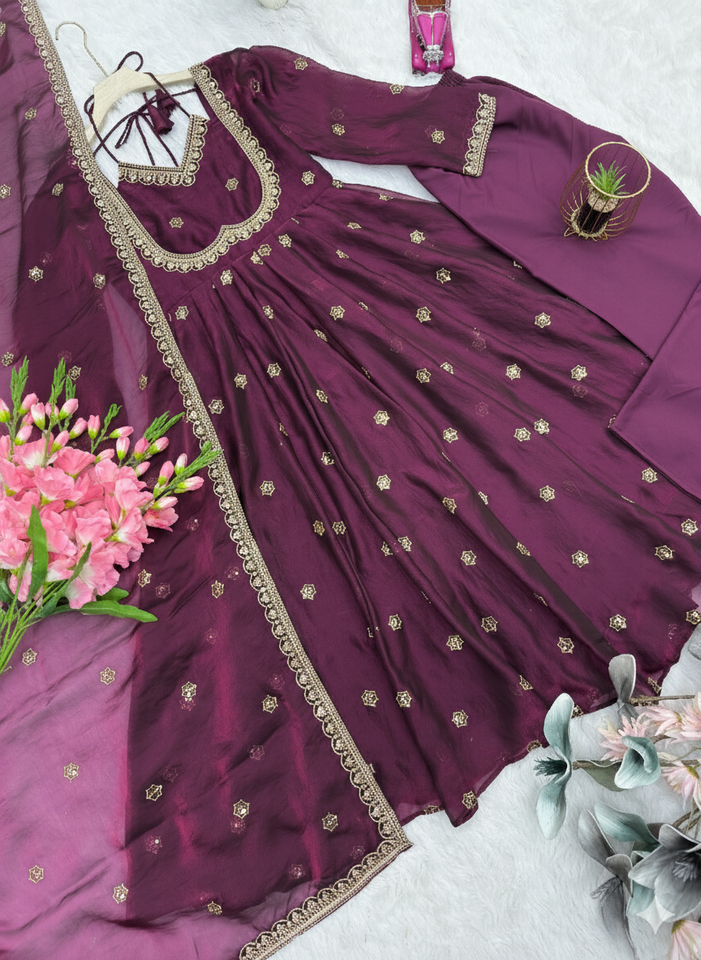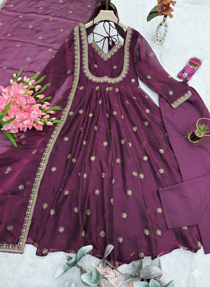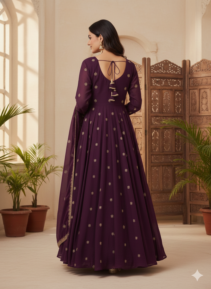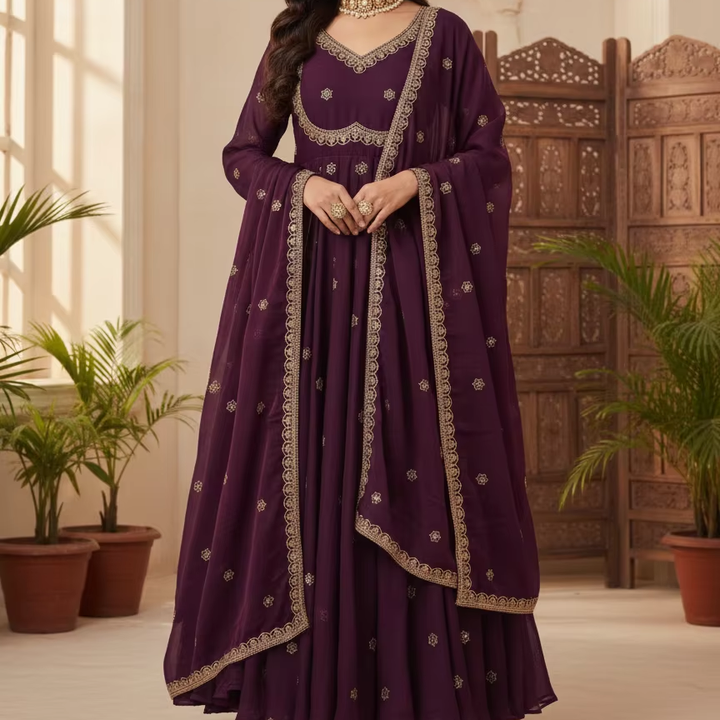 Traje Anarkali de Georgette Morado Premium Unity Luxure con Dupatta, Bordado Intenso, Conjunto de Una Pieza, Largo hasta el Tobillo, para Fiestas y Bodas