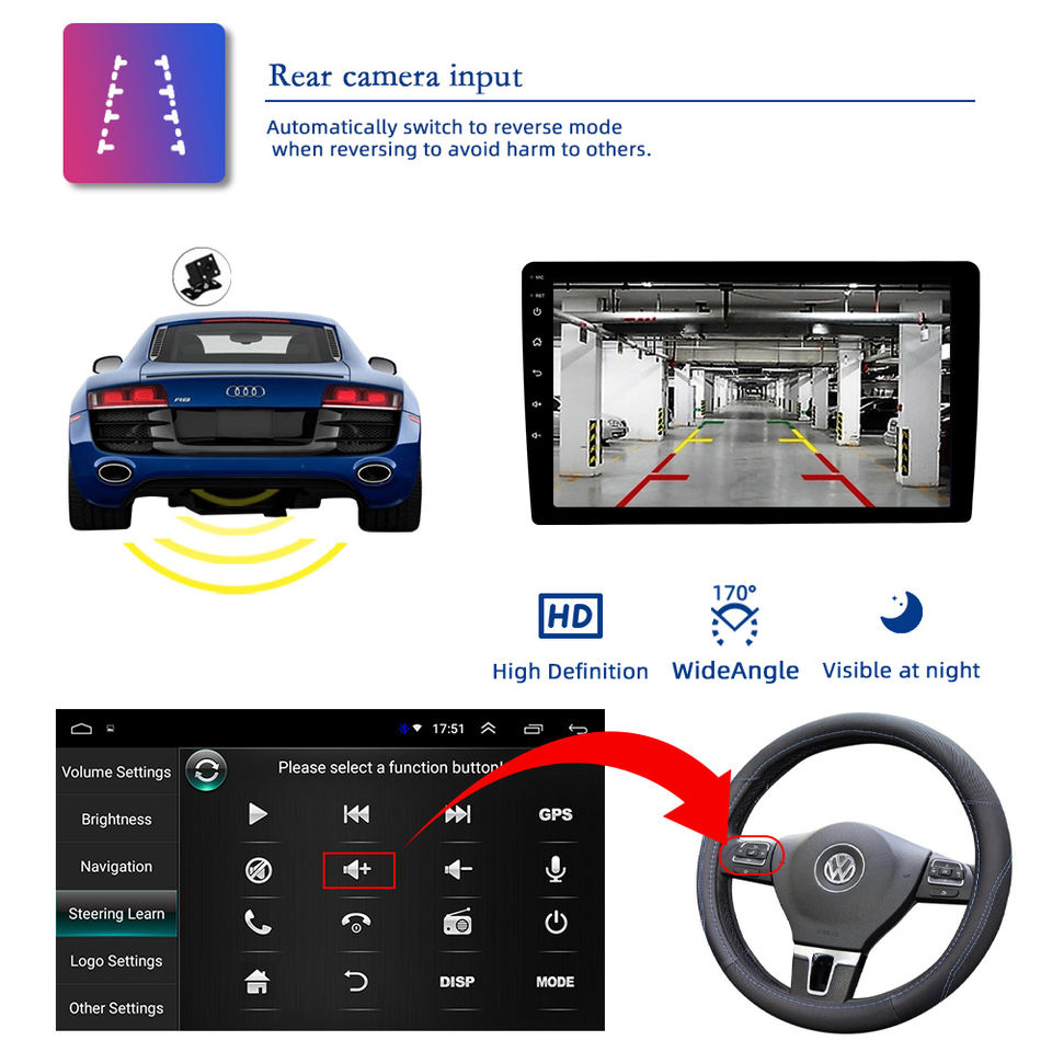 GPS, Estéreo, MANOS LIBRES, RGB, OBD2, Enlace espejo, Android auto, Imagen en la imagen, Micrófono incorporado, Pantalla dividida, Administrador de archivos, Hi-Res Audio, Coche de Control de volanteFunción
