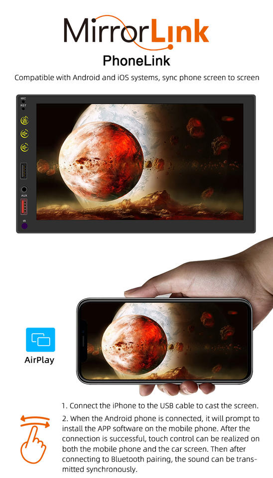 CarPlay, Enlace espejo, Android auto, MP3/MP4, Pantalla táctil, Visor de imágenes, Sintonizador Radio, Cargador de coche, Control remoto, Amplificador, Cámara de copia de seguridad, Guía de voz, Control del Volante, Pantalla dividida, Carretera de planificación, Distancia de advertencia, Invertir la ayuda, En directo/aparcamiento, En directo/Live el tráfico, MultiMedia apoya, De modo Dual, sistema de navegación, Velocidad de alerta, OtrosFunción