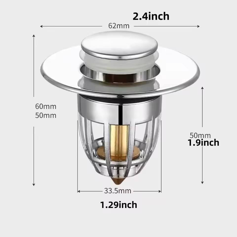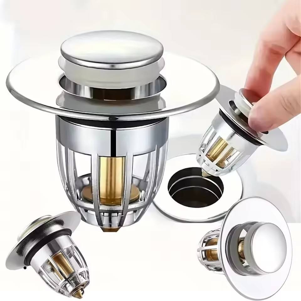 Filtro universal de desagüe con rebote, tapón emergente cromado para lavabo con atrapapelos, tapón de desagüe para lavabo de baño de fácil apertura tipo pulsador