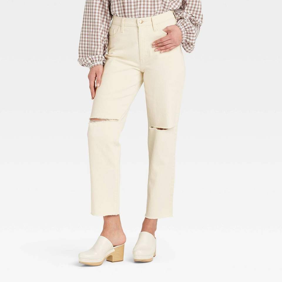 Pantalones vaqueros universales de tiro alto vintage rectos para mujer, color blanco roto, talla 16, corte de bota acampanado, lavables, rasgados, talla XL