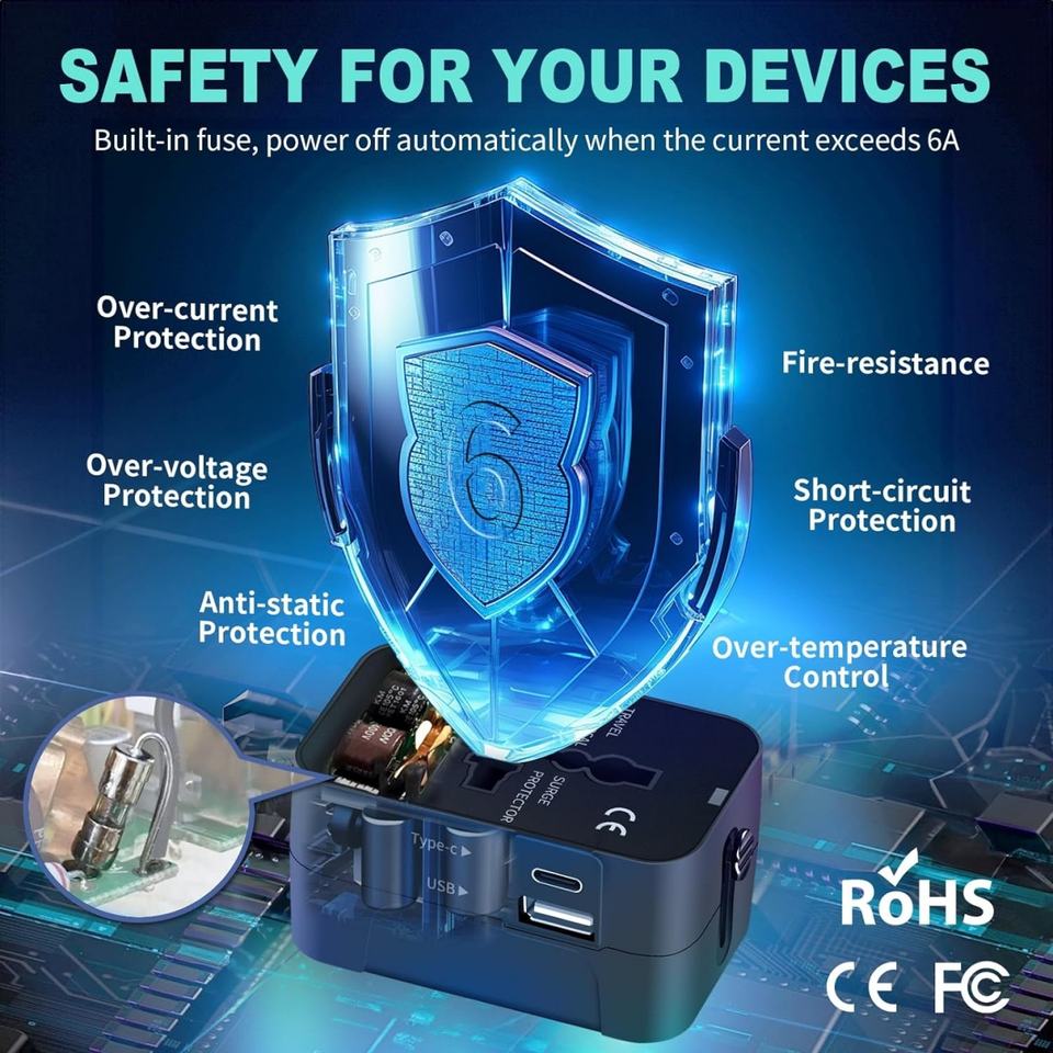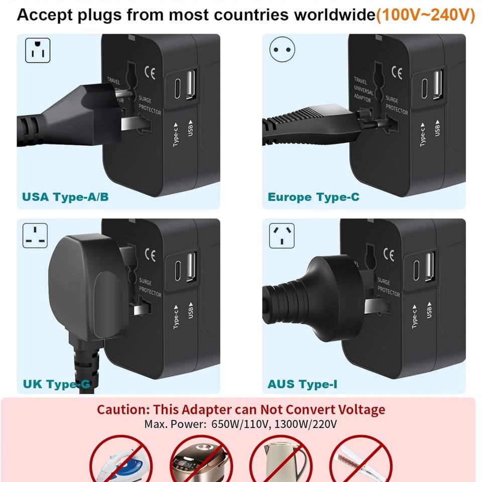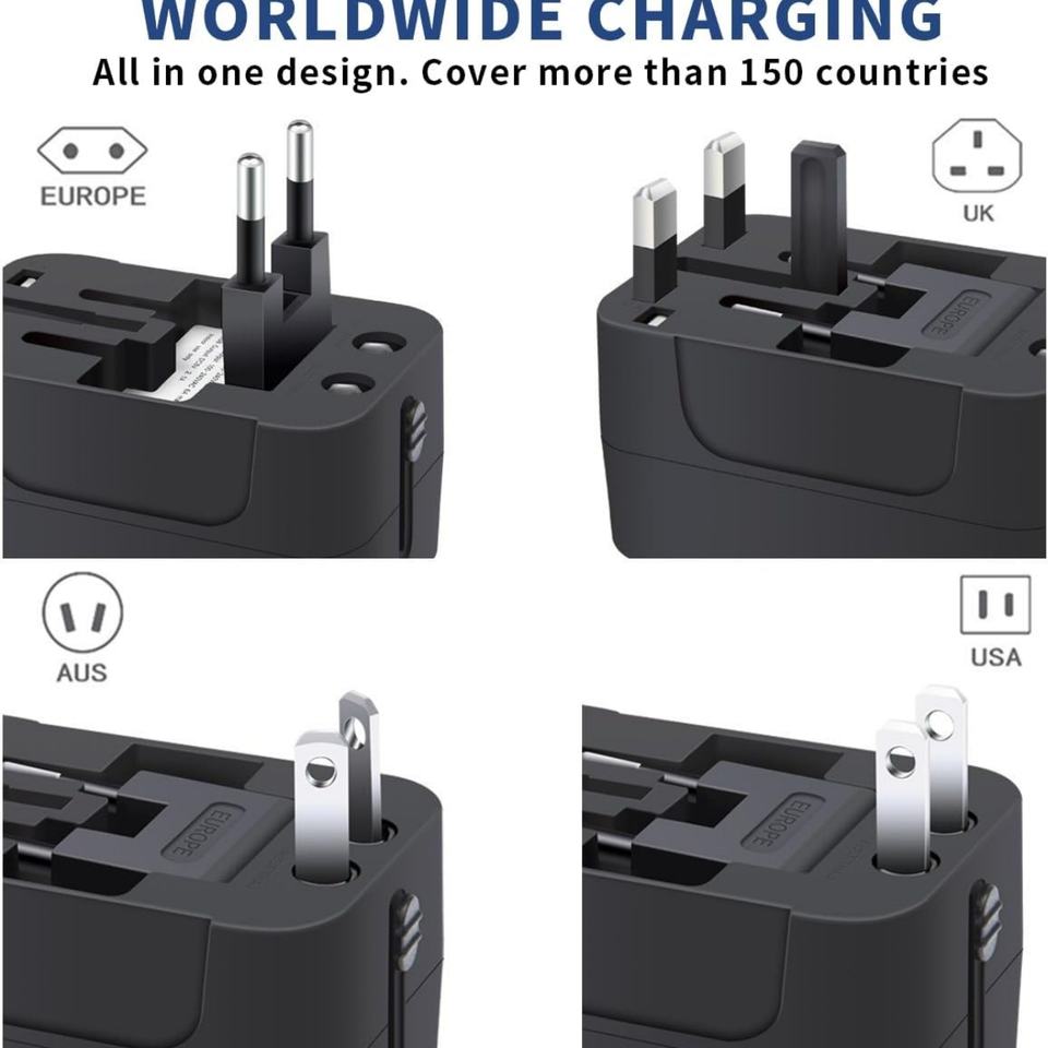 Adaptador de Viaje Universal con USB C - Cargador de Pared Todo en Uno con Adaptador de Enchufe de Corriente Alterna para EE. UU., UE, Reino Unido y Australia