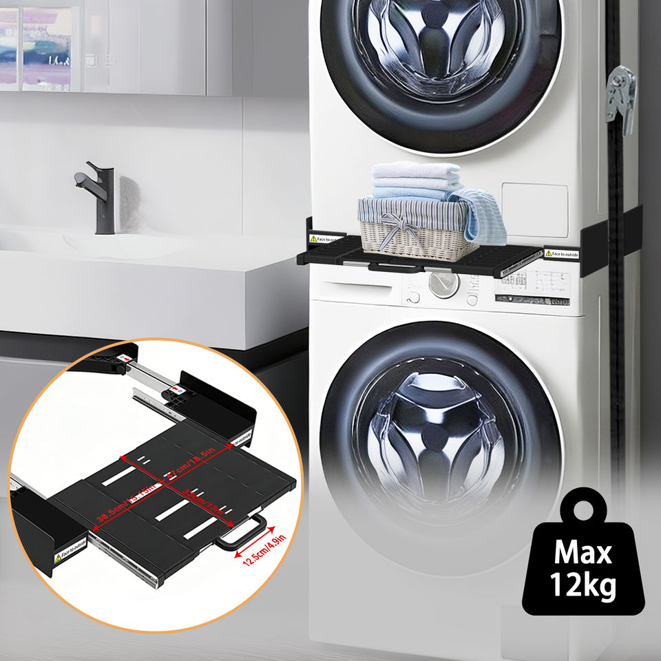 Kit Universal para Apilar Lavadora y Secadora con Estante de Secado Extraíble, Marco Telescópico de Empuje y Tracción, Base de Acero Inoxidable para Lavadora