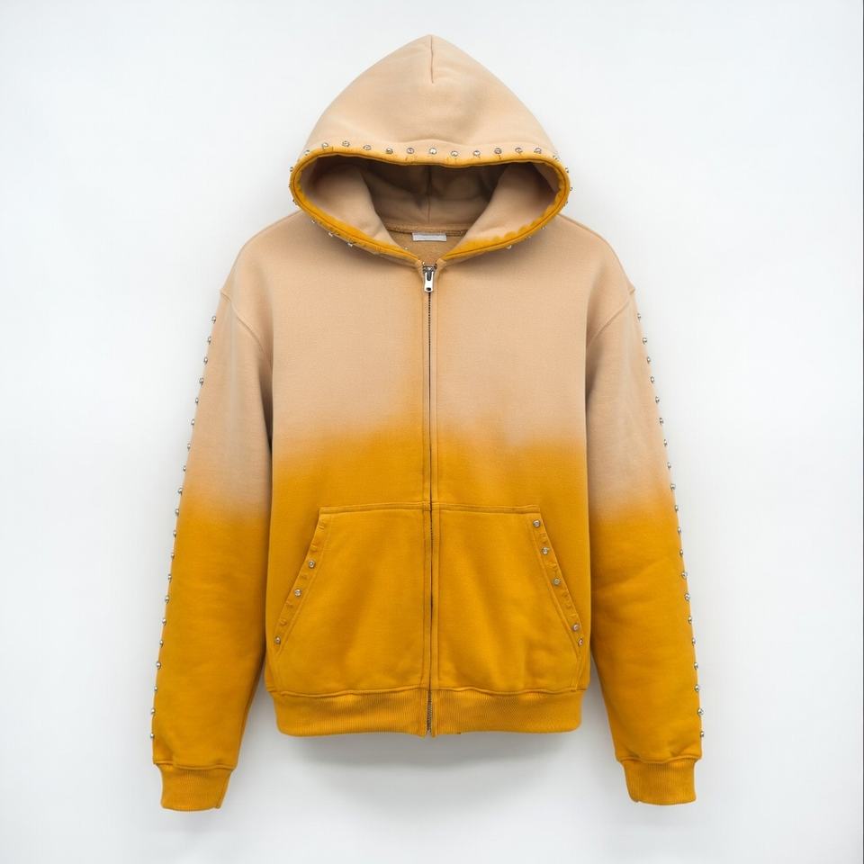 Sudadera con capucha extragrande de felpa francesa con cremallera y logotipo personalizado impreso, de algodón 100% de alto gramaje, estilo vintage desgastado con pedrería.