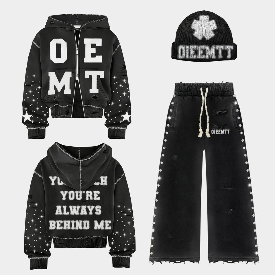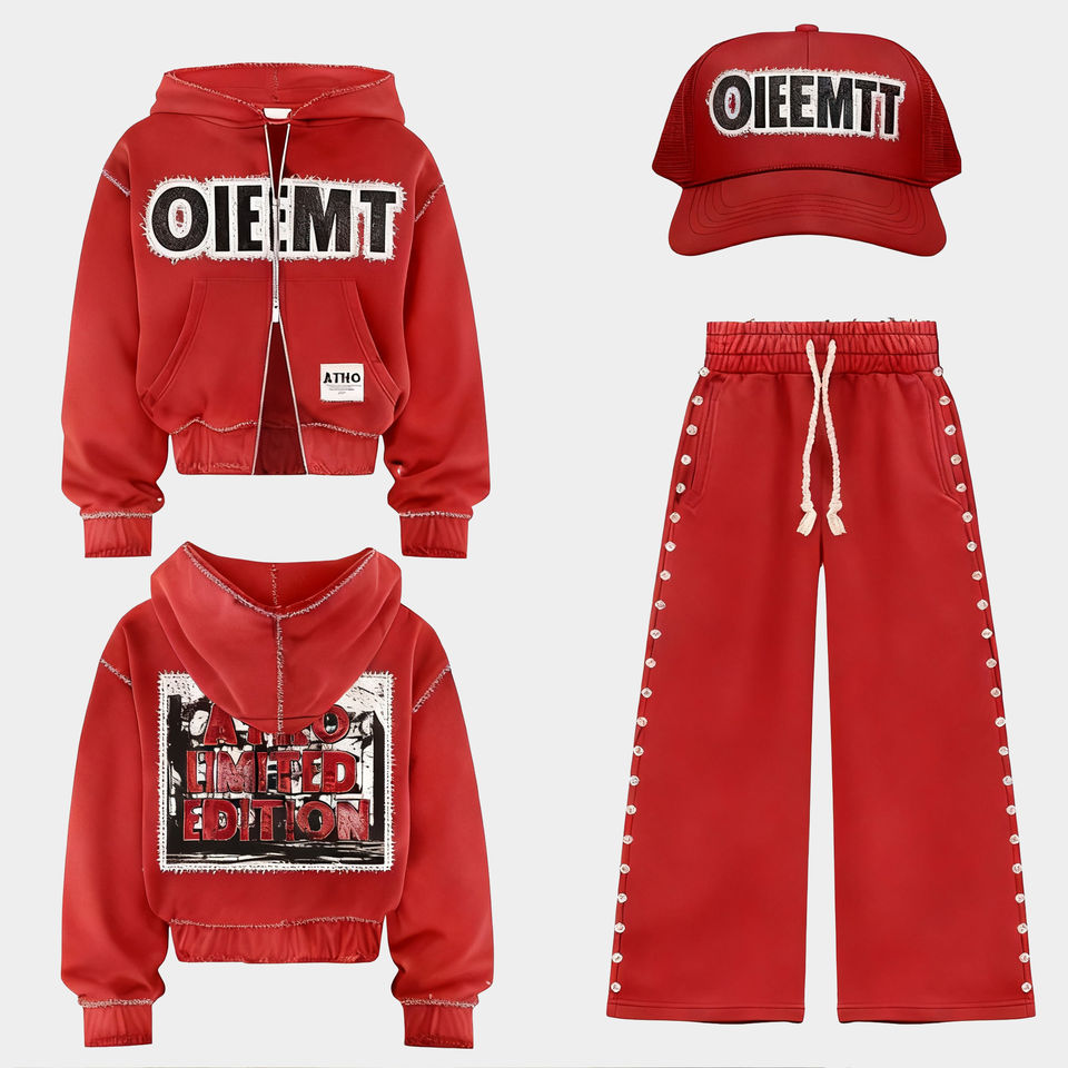 Conjunto de Sudadera con Capucha y Pantalones Deportivos Unisex, Estilo Boxy, con Estampado Personalizado, Lavado Ácido, Cierre de Cremallera, para Ropa Urbana
