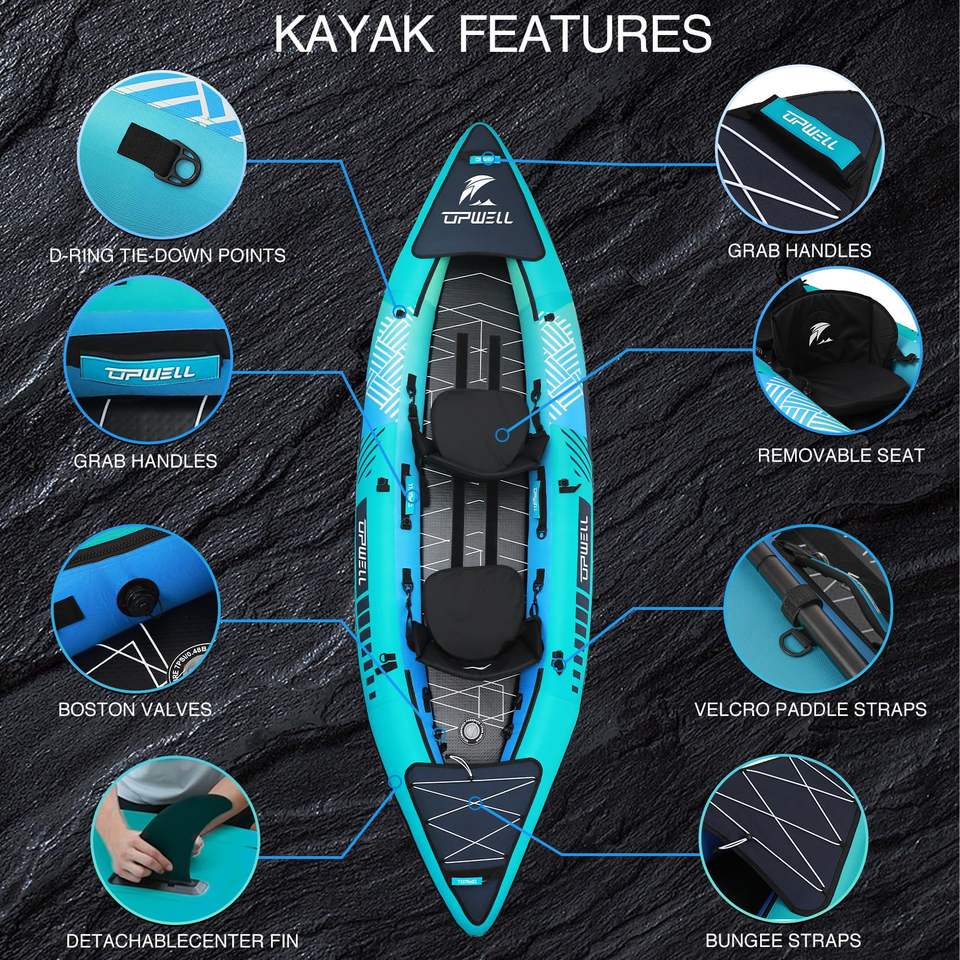 Kayak inflable Upwell para 2 personas, color azul aurora, con asiento doble, remo, bomba y bolsa de transporte para pesca y recreación.