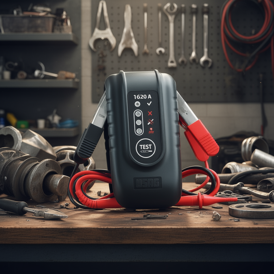 Características:Botón de PRUEBA, luces indicadoras, clasificación de 1620 A, pinzas rojas y negras