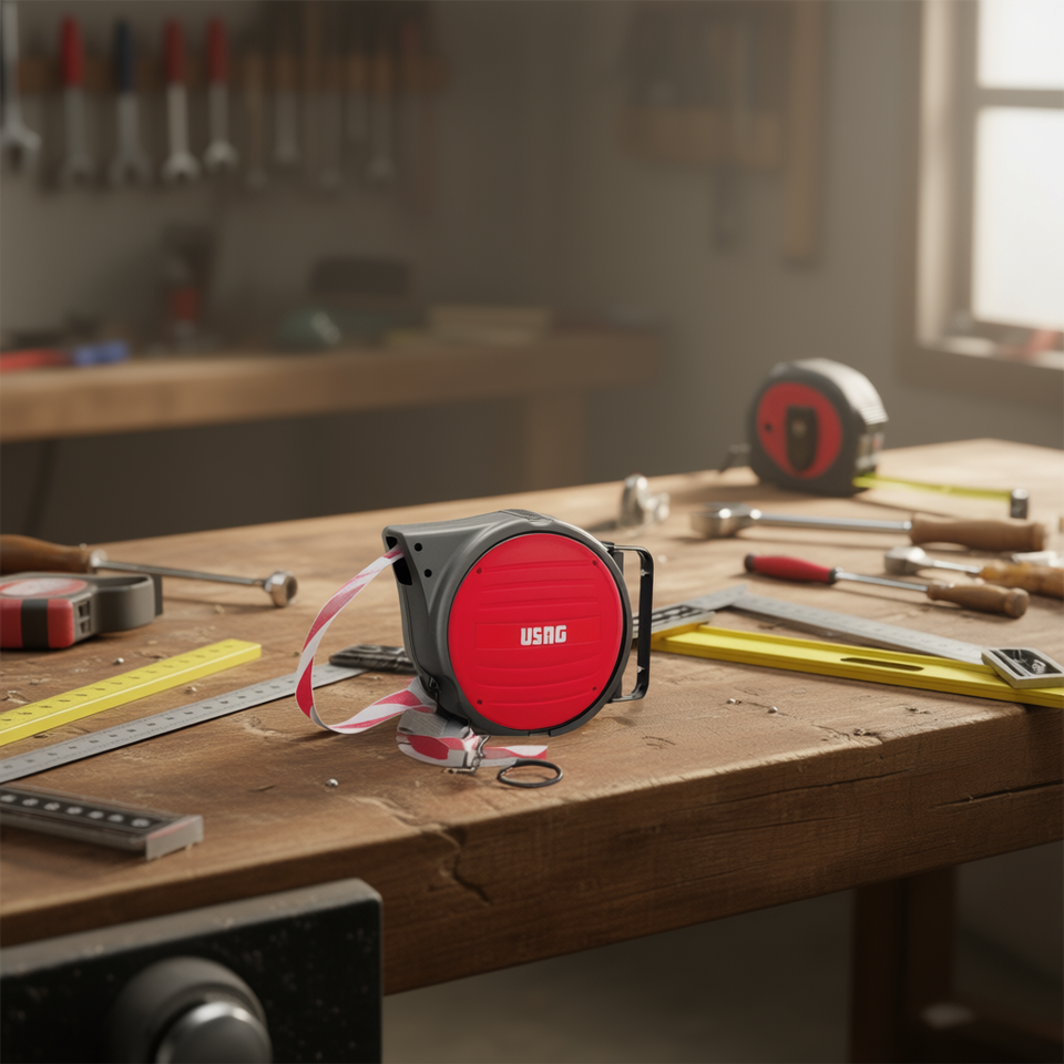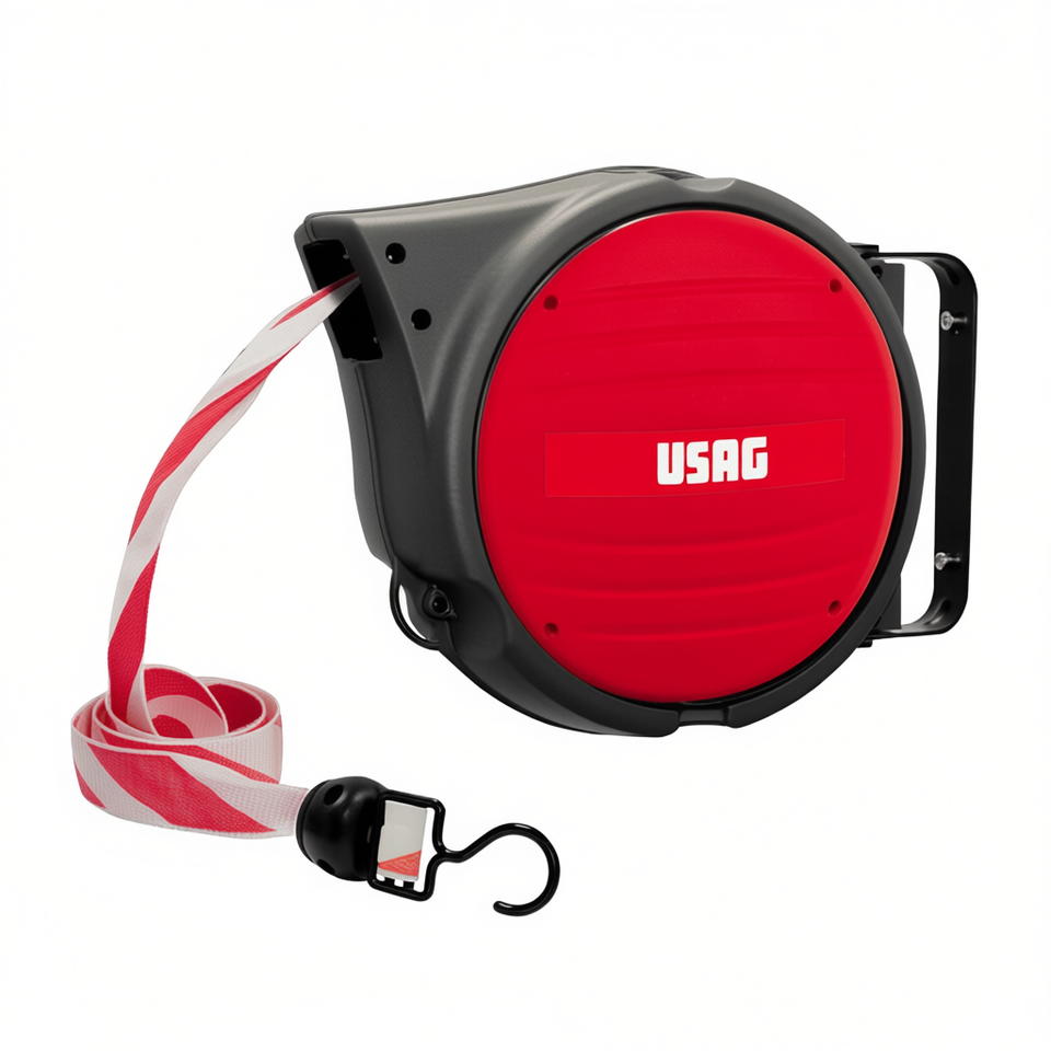 Cinta métrica retráctil Usag de 10 m con rayas rojas y blancas y gancho para medir