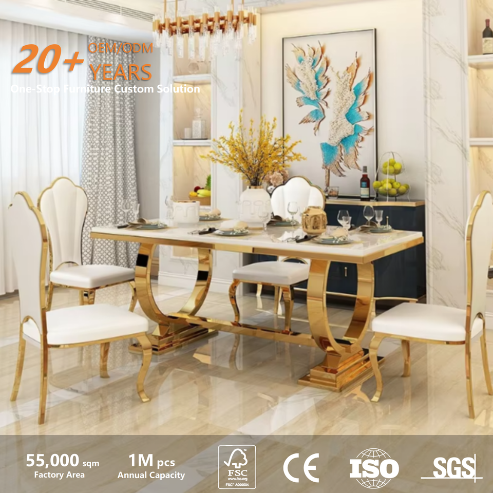 Juego de Comedor de Acero Inoxidable y Mármol Usado, Mesa para 6 Personas con Cajones, Marco Dorado, para Restaurante Comercial, Precio Económico al por Mayor