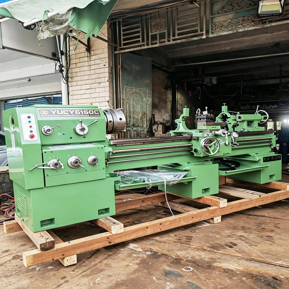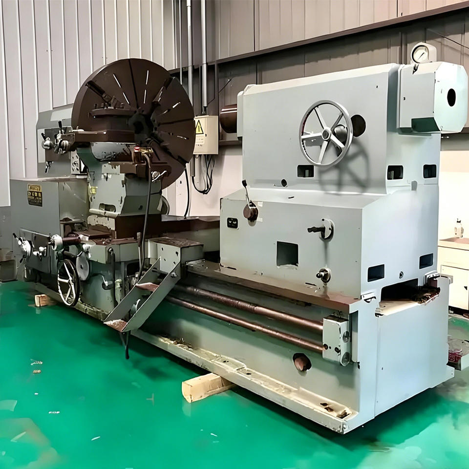 Torno horizontal usado con accesorios completos, transmisión de engranajes estable y rendimiento preciso en el torneado de metales.