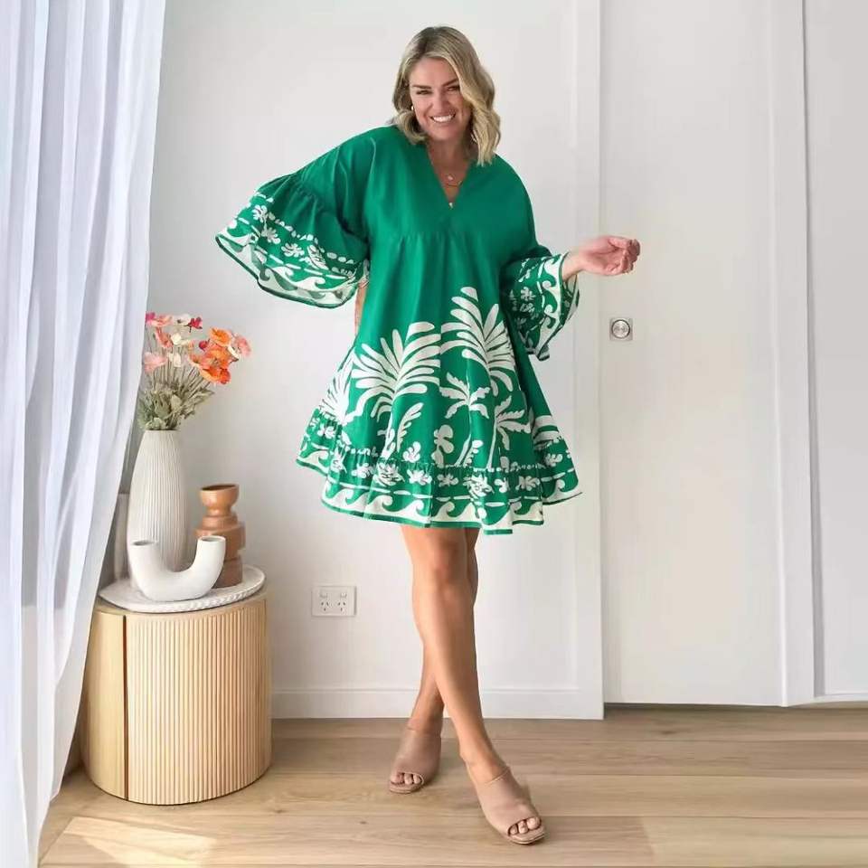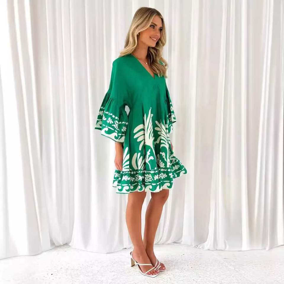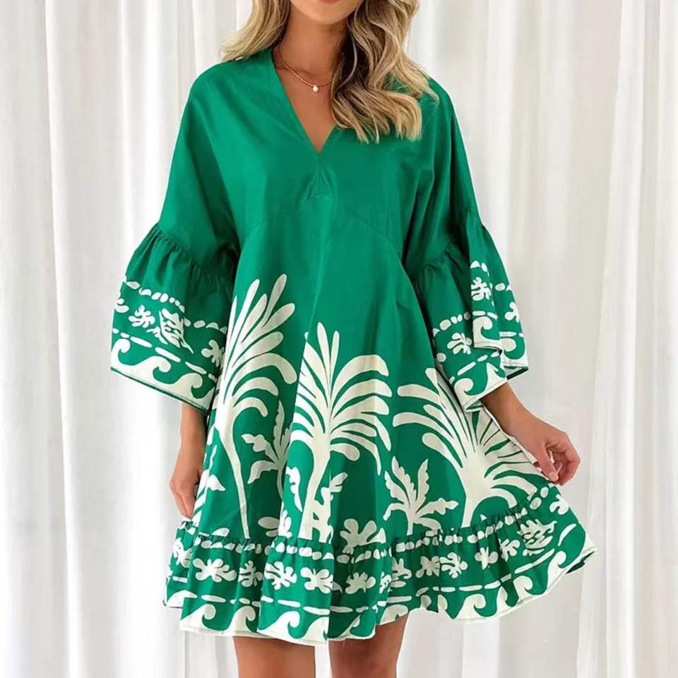 Vestido mini con cuello en V y manga media acampanada, informal, festivo, con volantes, floral, estilo bohemio, holgado, para playa, para mujer, de verano.