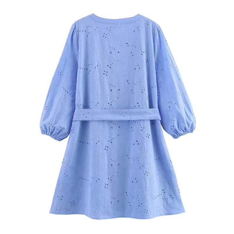 Vestido Mini Casual de Moda para Mujer, Cuello en V, Lazos Azules, Bordado con Ojales, Manga Larga