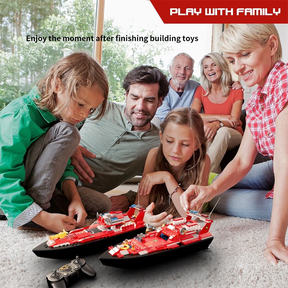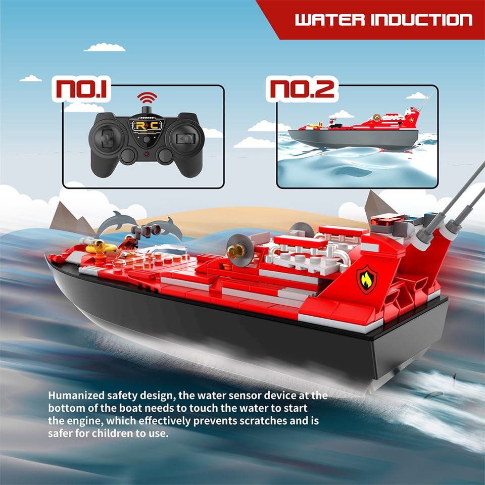 Barco teledirigido V102 RC 2.4G, barco de velocidad con control remoto 2 en 1, juguete de bloques de construcción de barco de rescate contra incendios para niños