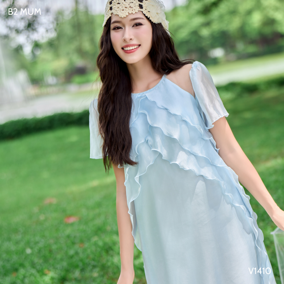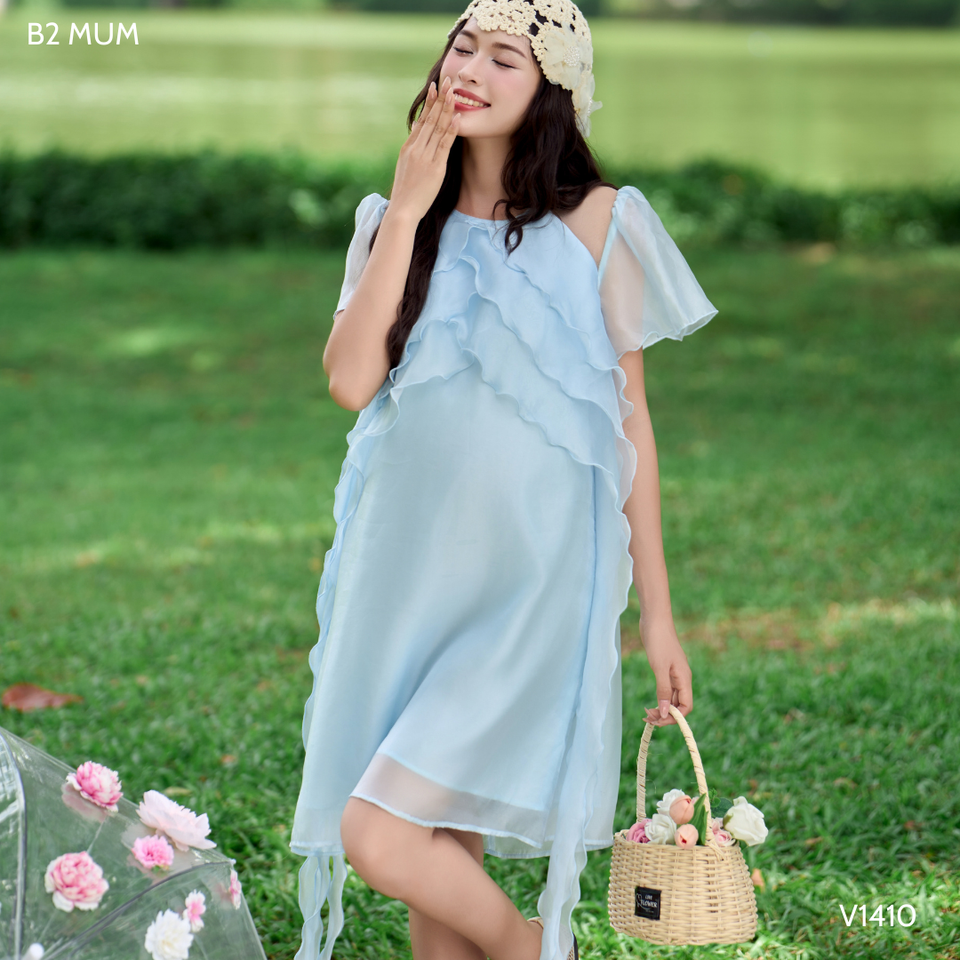 V1410 vestido de seda con volantes azul para mujeres embarazadas suave fresco absorbente de sudor tela de seda Perla 2 capas cremallera trasera verano