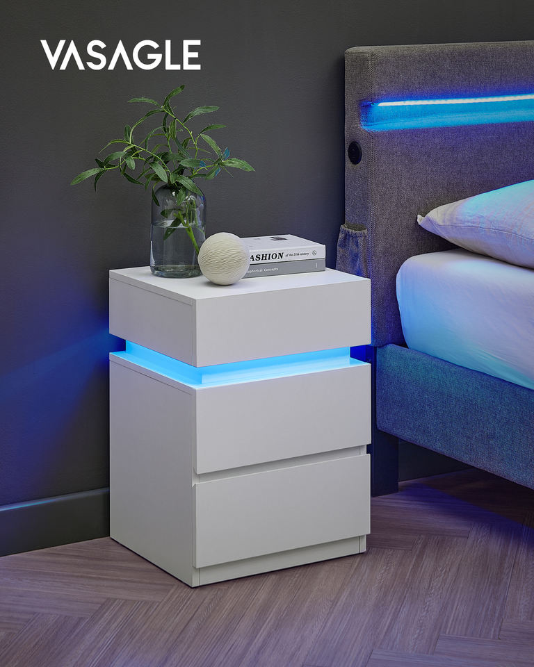 Mesa Auxiliar de Sofá VASAGLE con 3 Cajones y Colores Ajustables para Dormitorio, Sala de Estar, Mesita de Noche Inteligente con Luz LED