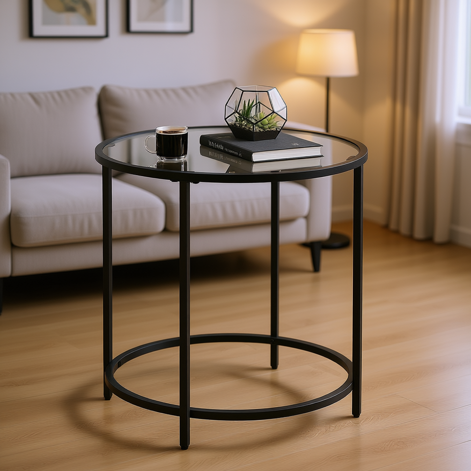Mesa de Centro VASAGLE de Vidrio Templado con Marco de Metal, Diseño Moderno y Minimalista, Mueble para Sala de Estar, Color Negro Tinta, Forma Redonda, Fácil de Armar