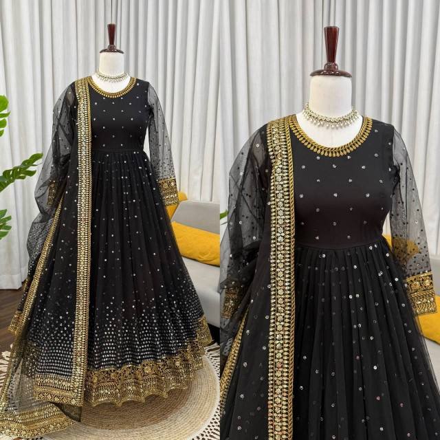Conjunto de traje Anarkali VASTRA COTTAGE con red de mariposas, pantalón con lentejuelas y bordados, dupatta, pantalón con cintura elástica, ropa étnica festiva