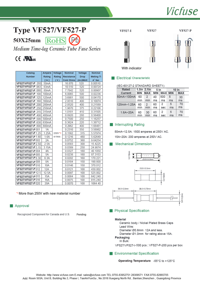 Fusible de tubo de cerámica de acción rápida VF524/500V AC/DC 50mA-30A 7000A capacidad de interrupción RoHS y certificado CE