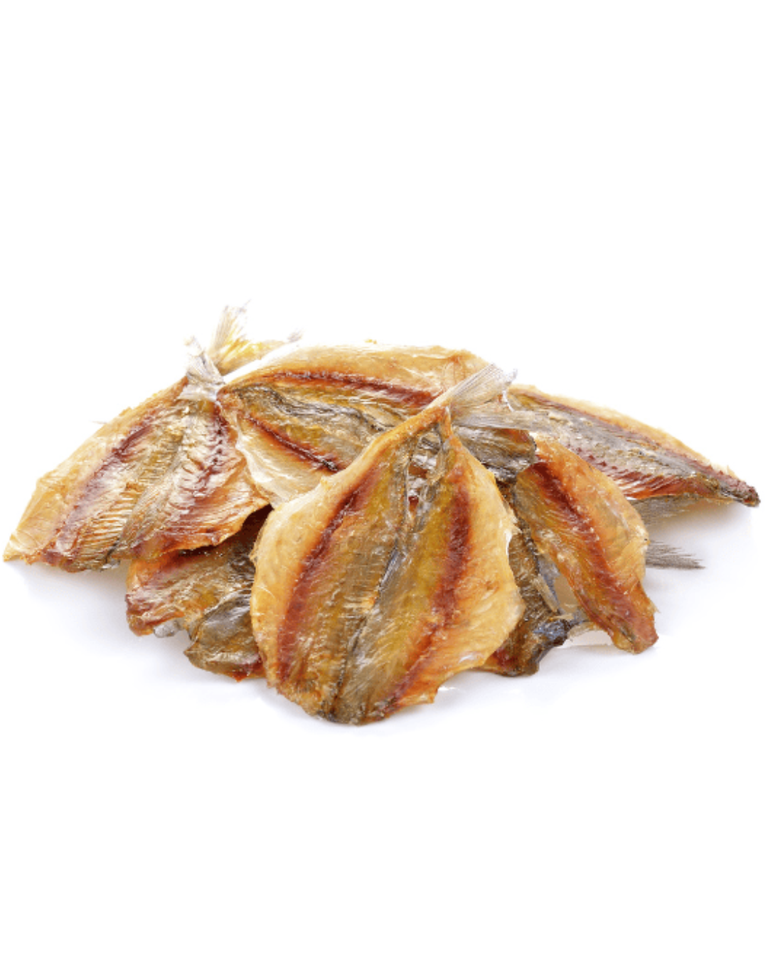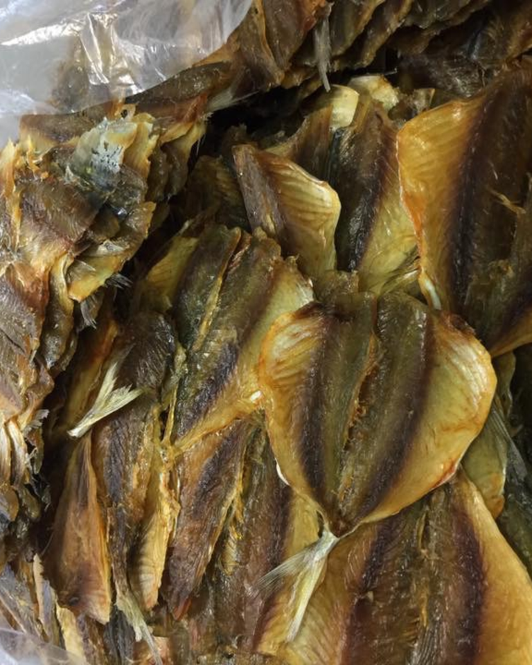 Contenido:Pescado de rayas amarillas secado al sol