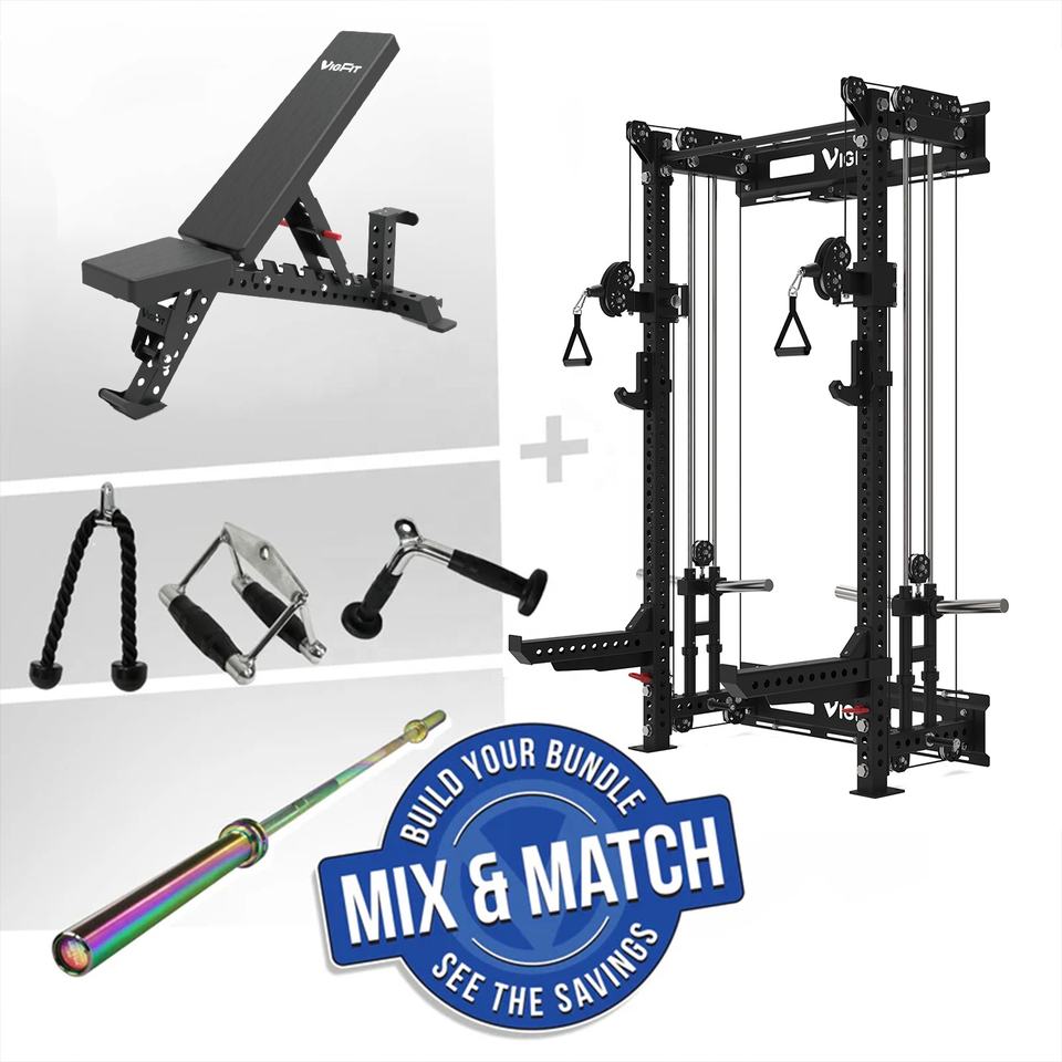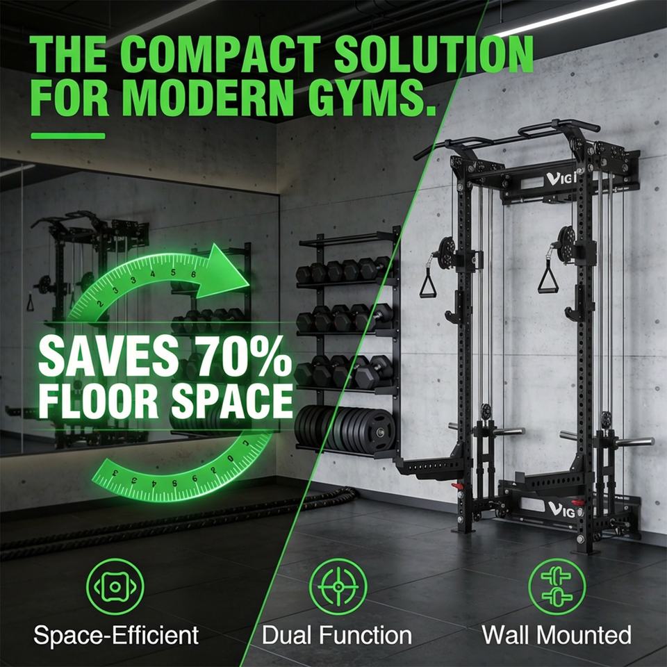 VIGFIT Rack de Sentadillas Funcional Comercial Montado en Pared con Cables y Gancho en J, Equipo de Gimnasio Plegable para Fitness
