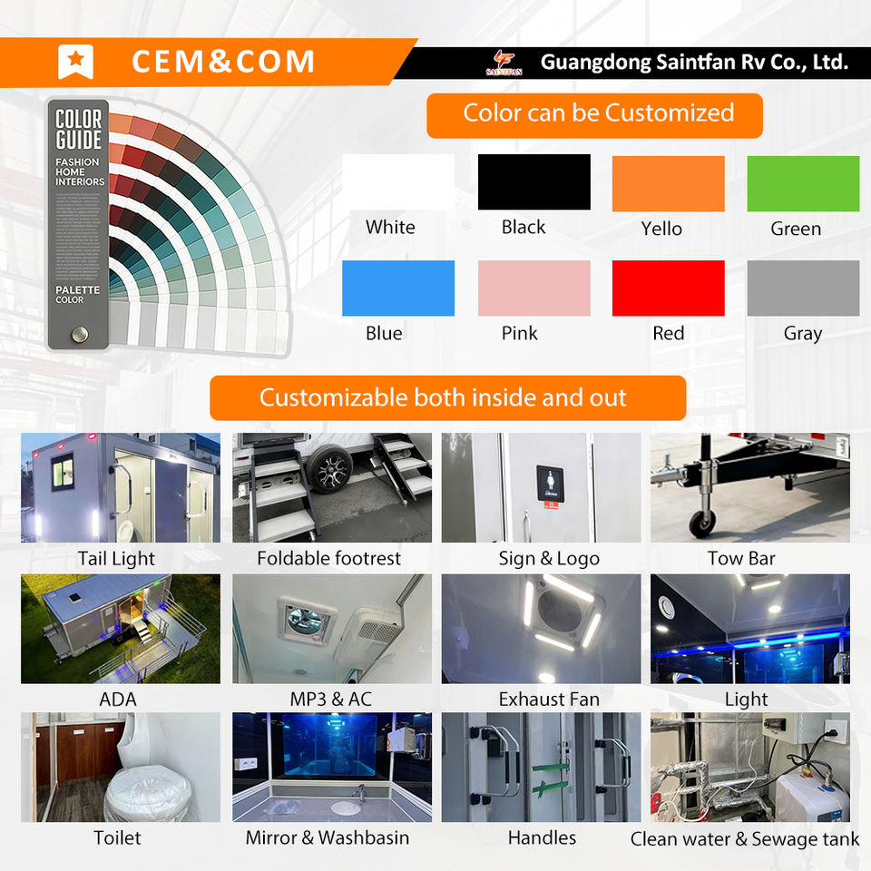 Uso:Inodoro móvil grande para hombres y mujeres, se conecta a fosas sépticas., combo de inodoro y ducha portátil en remolque